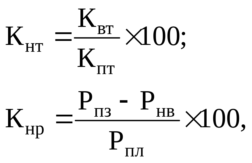 де — Кнт, Кнр — відсоток виконання тематичного плану за номен- клатурою відповідно за кількістю позицій плану та за кошторисною вартістю виконаної роботи; Квт, Кпт — кількість позицій тематичного плану відповідно виконаних і за планом; Рпл, Рнв —відповідно кошторисна вартість робіт, передбачених планом, і за невиконаною планованою тематикою.