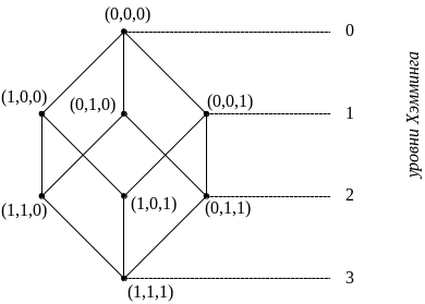 Формирование векторной решетки завершает правило, согласно которому каждые две ее точки, находящиеся на соседних уровнях и отстоящие друг относительно друга на расстоянии Хэмминга, равном единице, соединяются дугой.