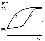 Кривая 1 характерна для растворов с высокой буферной ёмкостью. В этом случае при низких плотностях тока рН прикатодного слоя близко к рН в объёме электролита. При повышении плотности тока, то есть с увеличением скорости выделения водорода, его концентрация в приэлектродном слое повышается и слой подщелачивается. При низких буферных свойствах электролита протекание даже незначительных токов вызывает изменение рН околокатодного пространства (кривая 2). Буферные растворы сохраняют относительно постоянное значение рН, несмотря на добавление кислоты или щёлочи. Количественная характеристика буферности – буферная ёмкость.