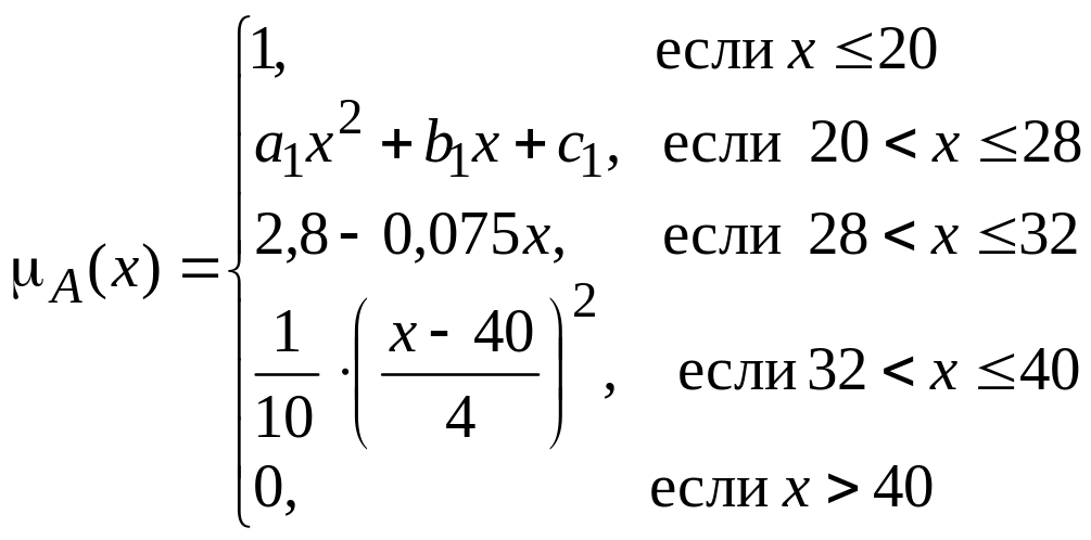 Построим аппроксимацию функции . При её построении будем использовать элементарные кривые. Например, через первые и последние 3 точки проведём параболы, а 2 средние точки (28; 0,7) и (32; 0,4) соединим прямой.