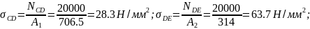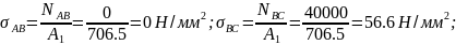 Подсчитываем нормальные напряжения на каждом участке, как отношение внутренних сил к площади поперечного сечения.