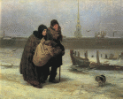 Бедныестарики,мужижена,вынужденныепокинутьпреж-нююквартиру,бредутпольдуНевыксвоемуновомуместуобитания.Ихлицаотражаютчувстварастерянностиине-доумения.Аскудныеодеждыиневеликиепожитки,собран-ныевгрязныйузел,подчёркиваютихжалкоеположение.Полноебезлюдье,илишьсъёжившаясяотхолодасобака,забежавшаявперёдждётпутников.Назаднемпланеве-личественновозвышаетсяшпильПетропавловскойкрепо-сти,которыйпогружаетзрителяватмосферу«униженных