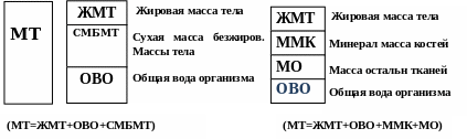 На (Рис. 1) приведены общепринятые модели состава массы тела человека. Это лабильные, метаболически активные показатели состава массы тела, которые являются довольно чувствительными индикаторами состояния тренированности, работоспособности. Они активно используются при