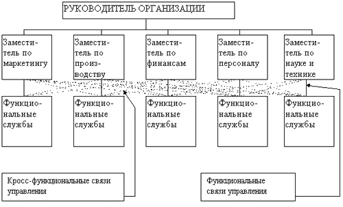В организации, построенной по этим принципам, могут как сохраняться функциональные подразделения (рисунок 6), так отсутствовать (рисунок 7). В первом случае работники находятся под двойным подчинением - административным (руководителю функционального подразделения, в котором они работают) и функциональным (руководителю рабочей группы или бригады, в которую они входят). Такая форма организации называется кросс-функциональной, во многом она близка к матричной. Во втором случае функциональные подразделения как таковые отсутствуют, ее мы будем назвать собственно бригадной. Такая форма достаточно широко применяется в организации управления по проектам.