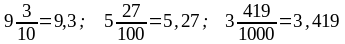 Бөлiмдерi 10, 100, 1000 т.с.с. болатын бөлшектердi бөлiмсiз жазуға болады. Ол үшiн алдымен бөлшектiң бүтiн бөлiгiн, сонан соң үтiр қойып, алымын жазады.