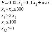 2. Задача об инвесторе. Инвестор, располагающий суммой в 300 тыс. ден. ед., может вложить свой капитал в акции автомобильного концерна А и строительного предприятия В. Чтобы уменьшить риск, акций А должно быть приобретено по крайней мере в два раза больше, чем акций В, причем последних можно купить не более чем на 100 тыс. ден. ед.Дивиденды по акциям А составляют 8% в год, по акциям В — 10%. Какую максимальную прибыль можно получить в первый год?