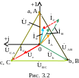3.2. Пример неполнофазного режима нагрузки, соединенной по схеме «треугольник», обусловленного обрывом нагрузки в фазе «bc» показан на рис. 3.9.