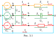 2.1. Пример полнофазной нагрузки, соединенной по схеме «звезда с нулевым проводом» показан на рис. 3.1, где каждая фаза обозначена соответствующим цветом, стрелки токов изображены красным цветом, а стрелки напряжений – зеленым цветом.