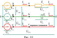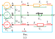 Если все фазы нагрузки содержат приемники, такой режим работы называют полнофазным. В случае обрыва провода в фазе или короткого замыкания в фазе нагрузка становится неполнофазной. При полнофазном режиме работы в случае отсутствия сопротивлений в линейных проводах линейные напряжения нагрузки равны линейным напряжениям источника.