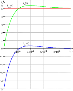 2.7. Строим график определяемой величины, на рис. 4.13 он изображен зеленым цветом. Красным цветом указан график принужденной составляющей тока, синим цветом – график свободной составляющей.
