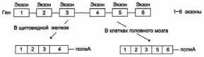 Иногда сплайсинг мРНК может проходить по альтернативному варианту. Например, в одной ткани функциональная мРНК может образовываться в результате соединения всех экзонов первичного транскрипта, а в другой – какой-то экзон будет вырезан вместе с фланкирующими его интронами. и образуется другая функциональная мРНК. Например, в клетках щитовидной железы сплайсинг первичного транскрипта приводит к образованию мРНК гена белка кальцитонина, которая включает 4 экзона. В клетках мозга образуется мРНК, содержащая экзоны 1, 2, 3, 5, 6 (Рис. 25):