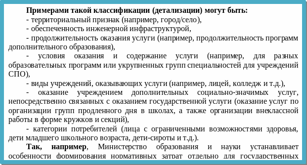 Нормативными актами предусмотрена возможность установления несколько значений нормативных затрат на оказание одной и той же услуги, характерных для разных условий ее оказания. В этом случае должен быть определен классификационный признак, на основании которого будет детализироваться норматив.