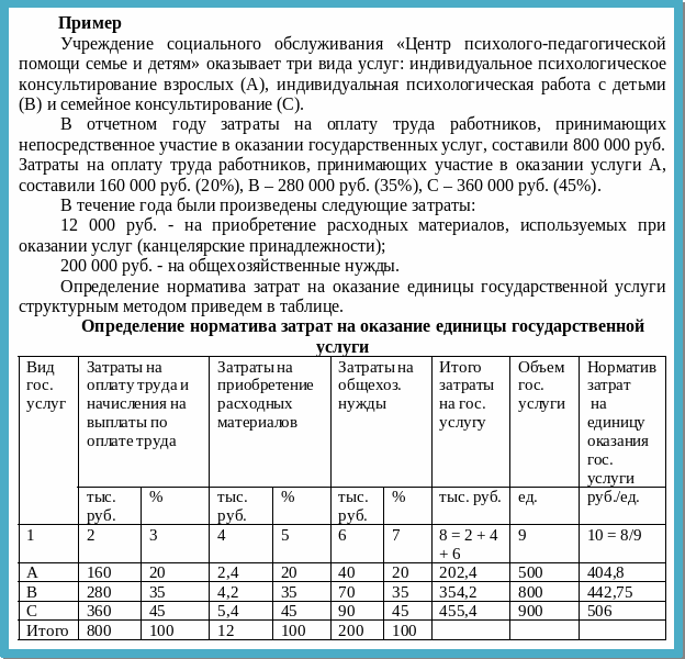 Рассмотрим комплексный пример применения структурного метода расчета норматива затрат на оказание услуги.