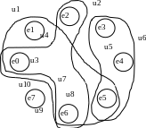 Любая функциональная или принципиальная схема состоит из набора элементов, заданным образом соединенных между собой. Поэтому схему можно рассматривать как некоторое множество элементов E={e1, e2, ..., em}, соединенных между собой цепями из множества U={u1, u2, ..., un}. Пусть дана электрическая схема (рис. 3.24).