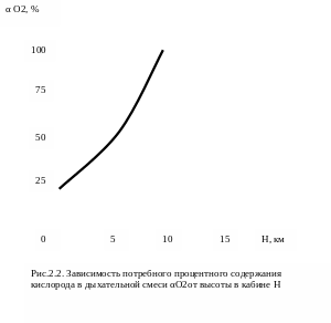Экспериментами установлено, что при подъеме на высоту в атмосфере Земли (и, соответственно, при уменьшении атмосферного давления) необходимо увеличивать (рис.2.2) процентное содержание кислорода αO2 во вдыхаемом воздухе (дыхательной смеси) и на высоте 10000м для дыхания требуется уже чистый кислород, а на высоте 12000м кислород для дыхания необходимо подавать под повышенным давлением, обеспечивающим постоянство парциального давления кислорода в легких независимо от высоты.
