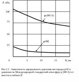На основании физиологических исследований установлена взаимосвязь между парциальным давлением кислорода в альвеолах легких и давлением воздуха, содержанием в нем кислорода, углекислого газа и водяных паров. С увеличением высоты пропорционально уменьшению общего атмосферного давления уменьшается парциальное давление кислорода pO2 в атмосферном воздухе (рис.2.1) и вместе с ним парциальное давление кислорода в альвеолах. На высоте порядка 3000м оно достигает среднего физиологически допустимого уровня, насыщение крови кислородом становится недостаточным, начинается гипоксия - кислородное голодание, особенно опасное тем, что субъективно человек не осознает своего состояния и, несмотря на кажущееся хорошее самочувствие, может внезапно потерять сознание.