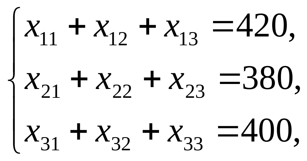 За умовою задачі необхідно вивезти весь вантаж з пунктів постачання, тому план перевезень повинен задовольняти такі умови