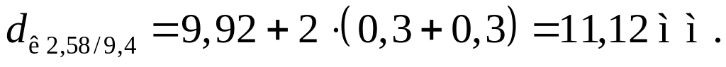 За виразом (1.29) розрахуємо діаметр ізольованої, екранованої коаксіальної пари 2,58/9,4 (dк 2,58/9,4). При цьому, згідно з табл. 1.17, діаметр зовнішнього проводу коаксіальної пари складає d0 = 9,92 мм, товщина екрана Δекр = 0,30 мм, товщина ізоляції коаксіальної пари Δіз = 0,30 мм: