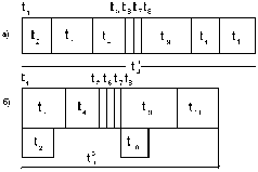 Вычисление длительности циклов (несовмещенного и совмещенного) надо иллюстрировать выполненными в масштабе схемами (рис. 5.3). Схема для совмещенных операций выполняется следующим образом. Не совмещаемые операции составляют в один ряд, а совмещаемые показываются сверху или снизу от основной, большей по длительности на совмещаемых, как это показано на рисунке 5.3б.