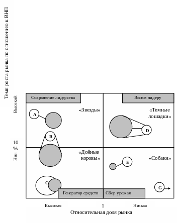 Матрица BCG, предложенная Бостонской консалтинговой группой, является первой и самой элементарной моделью анализа бизнес-портфеля предприятия. В 1970-е г. это была наиболее популярная и часто используемая модель анализа.