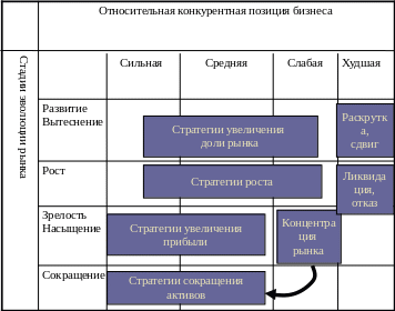 Стратегии роста. Их цель состоит в поддержании конкурентоспособности на быстрорастущих рынках. Абсолютный объем капиталовложений достаточно высок, но по сравнению с отраслевым уровнем он средний. На начальных стадиях рынки растут быстро и, чтобы не отставать от них, требуются значительные ресурсы. Более того, необходимо укрепить конкурентные позиции данного вида бизнеса до наступления стадии вытеснения. Одним из недостатков стратегий роста является то, что можно потратить ресурсы, но не добиться устойчивого конкурентного положения.