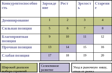 Матрица состоит из 20 ячеек. Каждая ячейка представляет собой разное сочетание стадии жизненного цикла и конкурентной позиции предприятия по рассматриваемому бизнес-направлению.