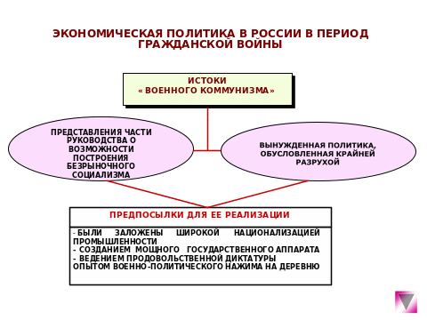 Большевики победили в Гражданской войне и отразили иностранную интервенцию. Эта победа была обусловлена рядом причин. Главный лозунг белых о восстановлении могущественной, единой и неделимой России не мог воодушевить большинство народных масс. Большевикам удалось мобилизовать все ресурсы страны, превратить ее в единый военный лагерь. Политика белых – отмена Декрета о земле, возвращение земли прежним владельцам, нежелание сотрудничать с либеральными и социалистическими партиями, карательные экспедиции – все это вызвало недовольство населения, вплоть до вооруженного сопротивления. В ходе Гражданской войны противникам большевиков не удалось договориться о единой программе и едином лидере движения.