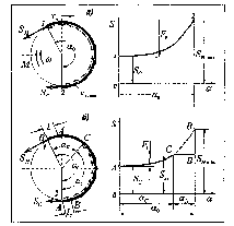 Рис. 5.2. Расчетные схемы передани тяговой силы и графики зависимостей натяжения ленты от угла обхвата: а - режим пробуксовки; б - номинальный режим.