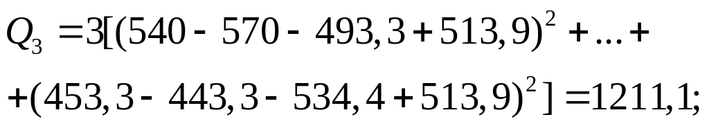 Из табл. 3 следует, что с увеличением количества голов в группе средний суточный привес поросят в среднем уменьшается, а при увеличении содержания протеина в корме - в среднем увеличивается. Но является ли эта тенденция достоверной или объясняется случайными причинами? Для ответа на этот вопрос по формулам табл. 2 вычислим необходимые суммы квадратов отклонений: