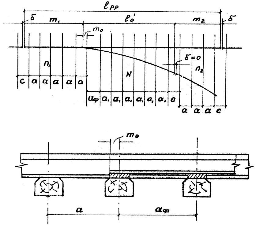 Длина рамного рельса, полученная по формуле, округляется в большую сторону и принимается равной 12,50; 18,75; 25,00 м за счет изменения заднего вылета рамного рельса m2.