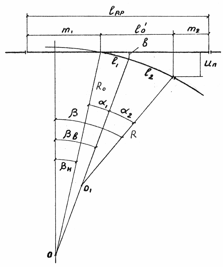 Величину проекции криволинейного остряка l'0 находим путем проектирования радиусов R0 и R на направление рабочей грани рамного рельса: