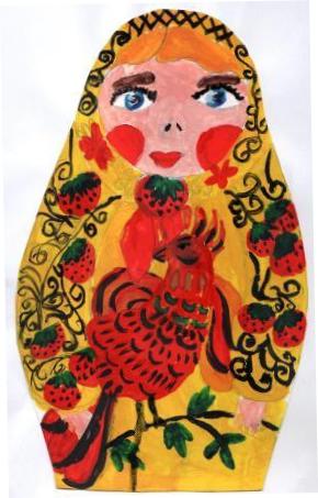 В технике Гжель применила прием росписи «крытьем», выполнила бордюры и сетку на костюме матрешки, тычки и мазки на сарафане.