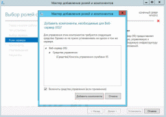 При этом мастер предложит нам добавить компоненты, необходимые для Веб-сервера, а именно «Консоль управления службами IIS» (IIS Management Console). Соглашаемся на установку дополнительных компонент нажав «Добавить компоненты» (Add Features) и жмем «Далее» (Next).