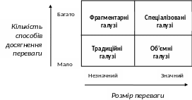 2) кількість шляхів досягнення конкурентної переваги та потенційний розмір переваги змінюється в залажності від галузі