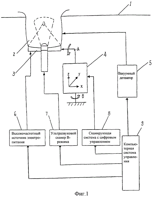 Система состоит из комбинированного датчика, источника энергии высокой интенсивности, ультразвукового сканера в В-режиме, многомерного устройства перемещения с цифровым управлением, вакуумного дегазатора, терапевтической кушетки и компьютерной системы управления (рис.1.21). Комбинированный датчик состоит из ультразвуковой головки В-режима и терапевтической головки, которая генерирует ультразвук с терапевтическим воздействием, при этом ее излучающий ультразвук конец установлен на многомерном аппарате перемещения, который осуществляет сканирующее перемещение снаружи плоскости тела под управлением компьютера. Изобретение позволяет повысить эффективность лечения опухолей внутренних органов за счет точности наведения и размещения терапевтической головки.
