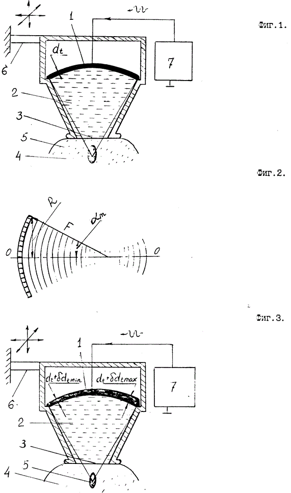 С этой стороной пьезоэлемента имеет акустический контакт устройство акустического согласования, обеспечивающее передачу энергии ультразвука к объекту воздействия. Выгнутая сторона излучателя соприкасается с воздушной средой. При этом энергия ультразвука передается в объект воздействия и фокусируется внутри него в фокальной области. С помощью приспособления для установки и фиксации излучателя фокальная область наводится на подлежащий воздействию участок биологической ткани; пьезоэлемент соединен с выходом генератора напряжения возбуждения.