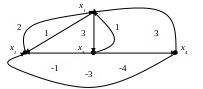 Метка вершины x3 изменилась на пятой итерации. Следовательно, граф имеет контур отрицательной длины. Его легко построить по вторым частям меток: x3 x4 x2 x1 x3. Задача не имеет решения.