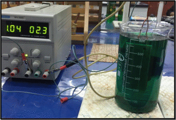 1. Prepare the electrolyte, i.e., solution. Take 75 g CuSO₄ and diluted in a glass of 500 ml of distillate. Add water and 25 g/ml H₂SO₄. Mix solution until complete dissolution of the precipitate.