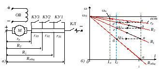 Рисунок 2.3 - Схема реостатного пуска и пусковая диаграмма двигателя с параллельным возбуждением