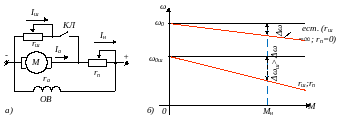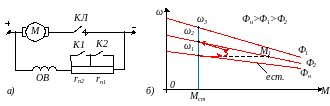 Рисунок 2.5 - Схема включения и механические характеристики двигателя при ослаблении потока
