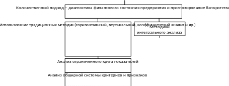 В современной практике для определения характера экономических нарушений в организации и оценки вероятности угрозы банкротства как заключительного этапа неблагоприятного кризисного развития целесообразно все методики рассматривать как минимум на двух уровнях. Качественный уровень предполагает выявление внутренних причин несостоятельности. Количественный подход следует рассматривать как диагностику и прогнозирование банкротства (рисунок 2).