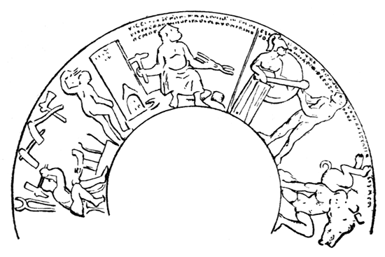 Для эллинистической эпохи всего меньше сведений мы имеем относительно способов обработки железа. Основное значение имело несомненно кузнечное дело, но детали производимых при этом операций совершенно нам не знакомы. Единственное известное нам изображение кузницы на памятнике эллинистической эпохи – это рельеф на "мегарской" чаше, хранящейся в Лувре (рис. 80).