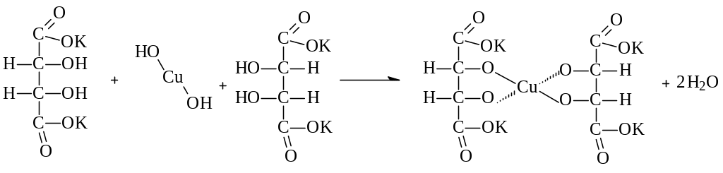 В пробирку наливают 2 мл 5% раствора сульфата меди и 1 мл 10%-ного раствора NaOH – выпадает голубой студенистый осадок гидроксида меди (II). К полученному осадку добавляют раствор тартрата калия, полученный в предыдущем опыте. Происходит растворение голубого осадка, и образование прозрачного раствора синего цвета вследствие получения растворимой комплексной соли меди за счет гидроксильных групп винной кислоты. При нагревании этого раствора не происходит никаких изменений: