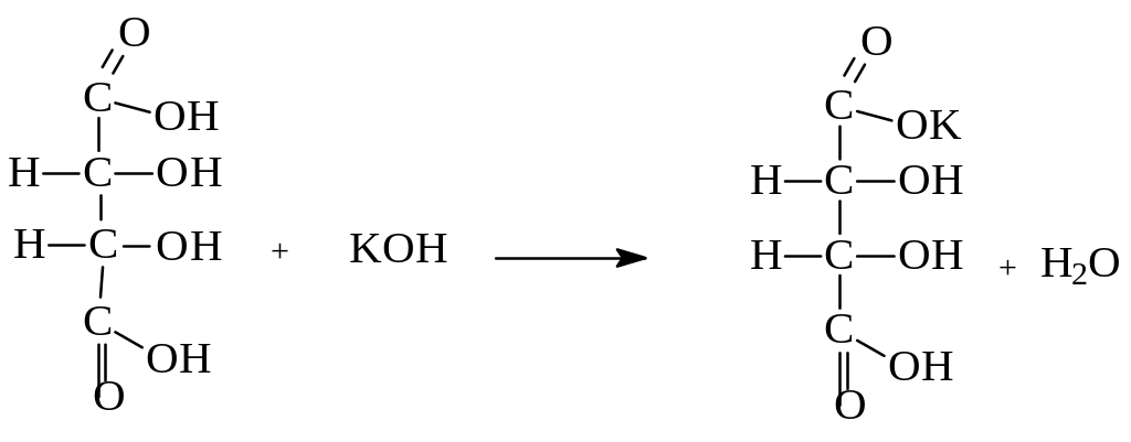 В пробирку наливают 2 мл 2н раствора винной кислоты (0,002 моль) и 0,5 моль 0,5н раствора гидроксида калия (0,00025 моль), перемешать. Через некоторое время наблюдается выделение белого осадка – кислой калиевой соли винной кислоты, растворимость которой в воде ниже, чем у самой кислоты. К полученному осадку добавляют несколько капель гидроксида калия так, чтобы щелочь была в избытке. Кристаллический осадок постепенно растворяется, образуется средняя калиевая соль винной кислоты, относительно хорошо растворимая в воде: