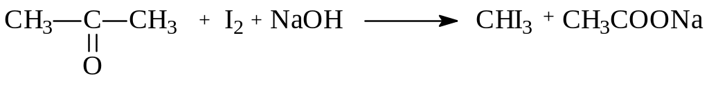 В пробирку наливают 3 мл (0,024 моль) и 3 мл 10% раствора серной кислоты (0,0033 моль). Содержимое пробирки нагревают на пламени горелки, предварительно закрыв пробирку с газоотводной трубкой. Конец газоотводной трубки опускают в другую пробирку с прозрачной известковой водой. Как только в пробирке образуется осадок, газоотводную трубку помещают в пробирку с раствором йода в йодиде калия, обесцвеченным 10% раствором гидроксида натрия. Появляется осадок желтоватого цвета – йодоформ СНI3: