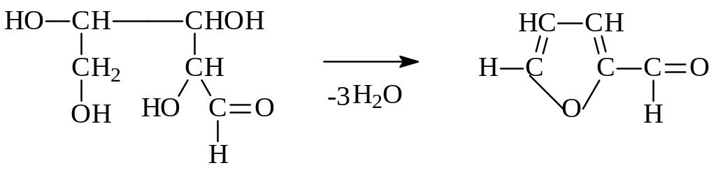 при нагревании, под действием кислоты пентозы теряют три молекулы воды и превращаются в фурфурол: