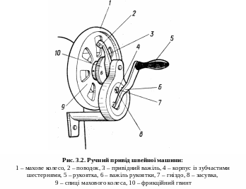 Ручний привід складається з поводка 2, привідного важеля 3 рукоятки 5 з важелем 6. Щоб з’єднати ручний привід з маховиком, поводок розташовують між спицями 9 махового колеса 1. Важіль рукоятки вставляється у гніздо 7 корпусу 4 і закріплюється засувкою 8. Щоб встановити швейну машину на робочий хід, необхідно фрикційний гвинт 10 повернути до упору за годинниковою стрілкою, притримуючи махове колесо рукою. Якщо потрібно встановити машину на вільний хід (для намотування нитки на шпульку), тоді фрикційний гвинт повертають проти годинникової стрілки.