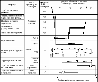 Время прибытия составов одного вида транспорта назначается в зависимости от времени прибытия составов другого вида транспорта и времени технических и маневровых операций, связанных с подачей судна и первой группы вагонов на перегрузочный фронт.