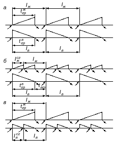Также графически определяется технологический интервал обработки вагонов одного состава на нескольких причалах, имеющих различное количество погрузочно-разгрузочных путей, разные производительность перегрузочных машин и время технических операций. В этом случае разрабатываются несколько графиков и выбирается вариант, обеспечивающий наименьшие простои вагонов.