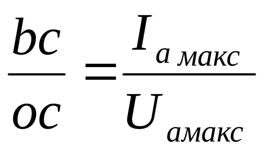 Розглянемо кількісну сторону цього явища. Нехай амплітуда змінної напруги на сітці дорівнює Uc макс; при крутизні характеристики лампи S і сталій анодній напрузі батареї, якби не було опору в анодному колі, ця змінна напруга викликала б появу змінної складової анодного струму, амплітуду якої можна визначити, розглядаючи трикутник оbс (рис. 56).